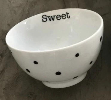 Bowl feito em porcelana com poá na parte externa e escrito na parte interna.