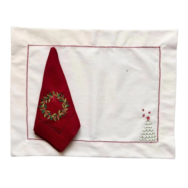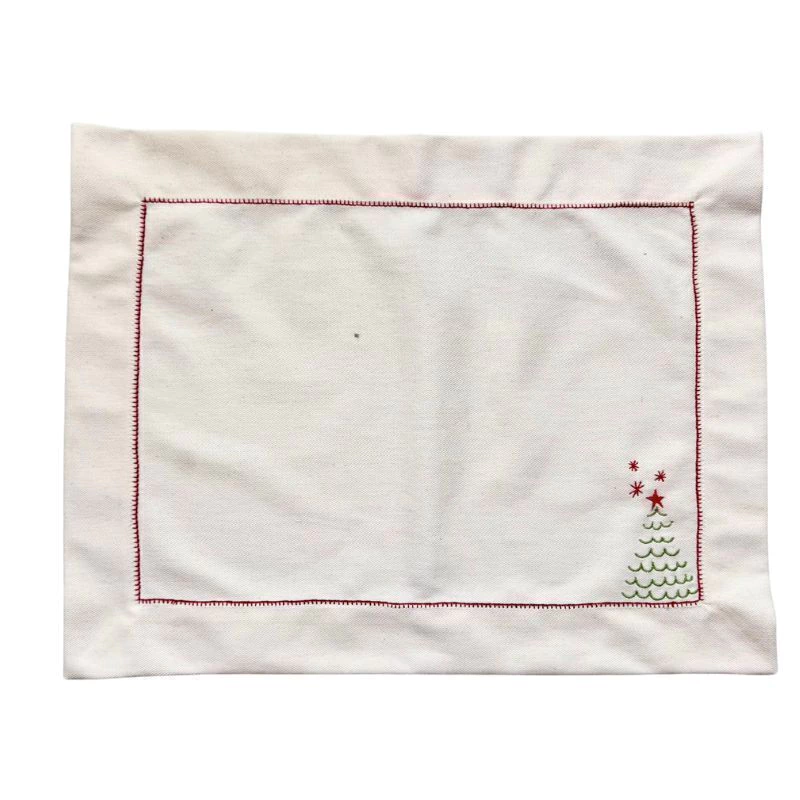 Feito em tecido 100% algodão mais encorpado, possui bordado caseado em toda a volta além de bordado de árvore de natal estilizada.