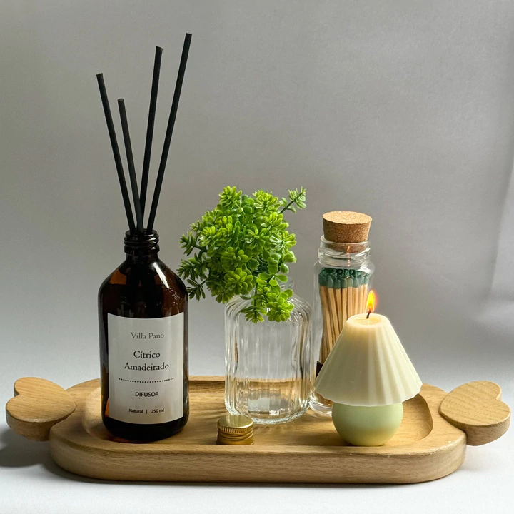 O kit Acompanha:1 Bandeja, 1 Vasinho de Vidro, 1 Pote de Fósforo, 1 vela e 1 Difusor Citrico Amadeirado.