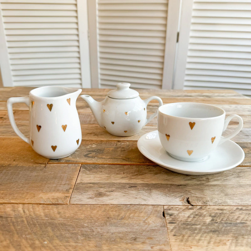 kit Mini bule + cremeira + xicara de cha coracoes dourados