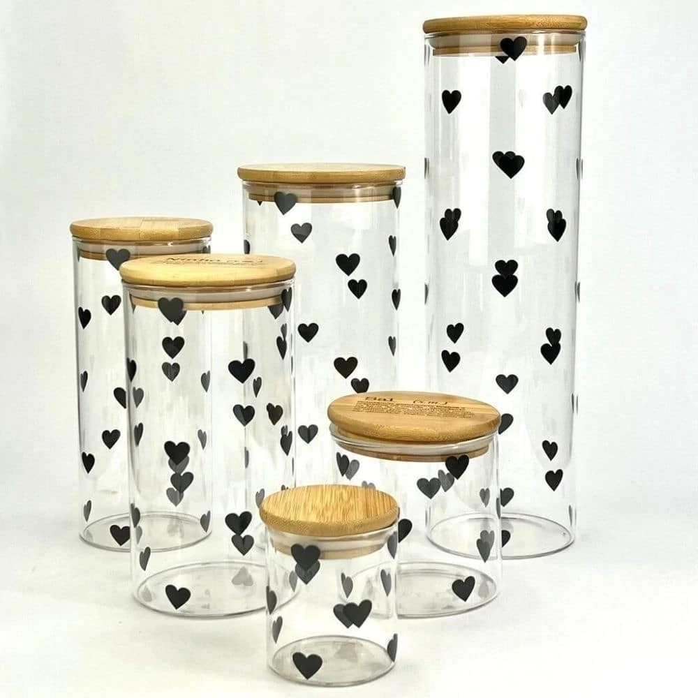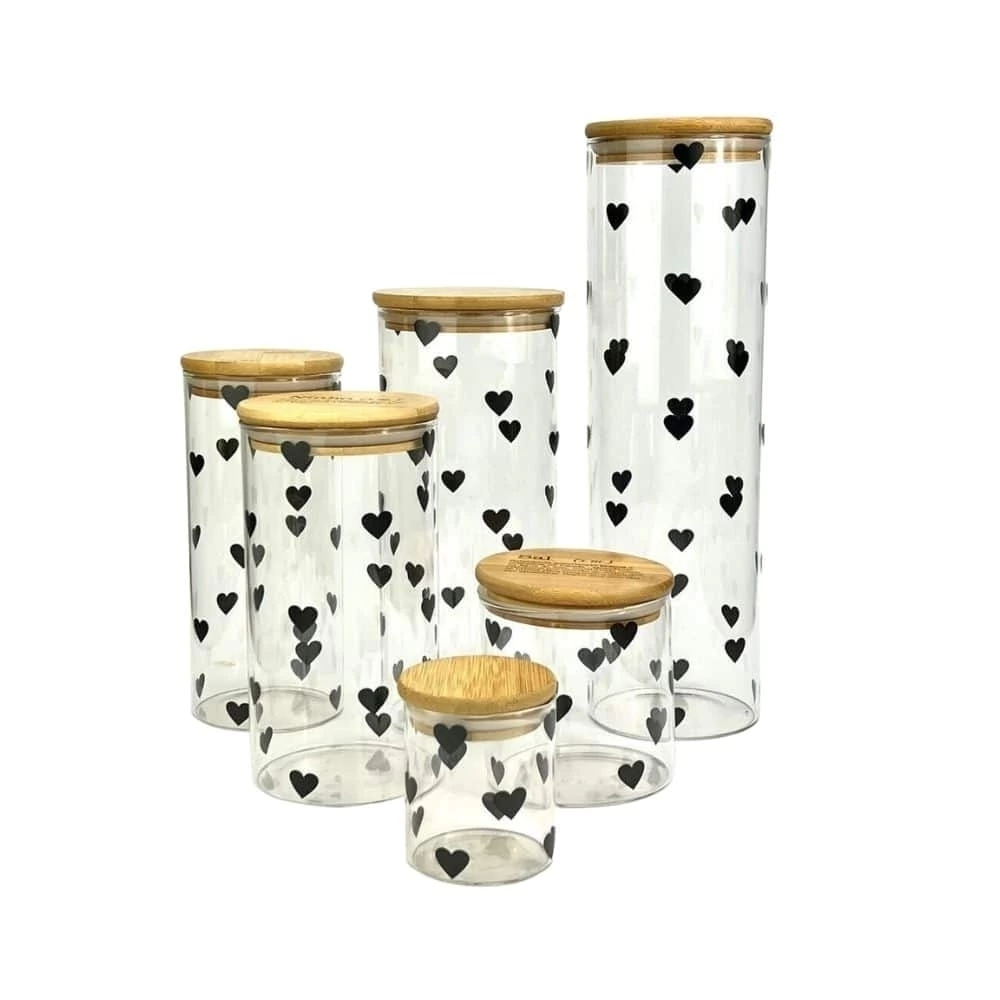 Kit que inclui todos os potes herméticos. Os potes são feitos em vidro com a estampa de corações pretos. Lindos potes para complementar a decoração de sua cozinha e organizar seus mantimentos.