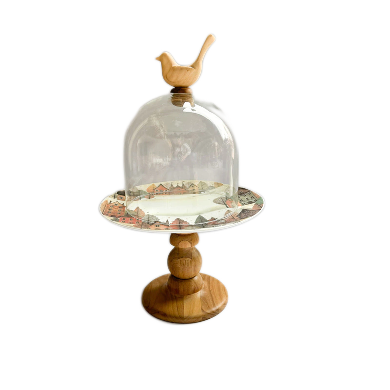 Cúpula de vidro 18cm diametro com prato de porcelana e base de madeira