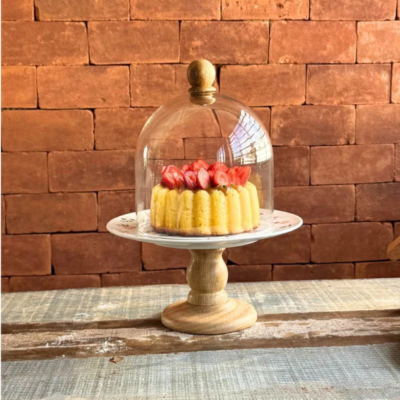 Cúpula de vidro 18cm diametro com prato de porcelana e base de madeira