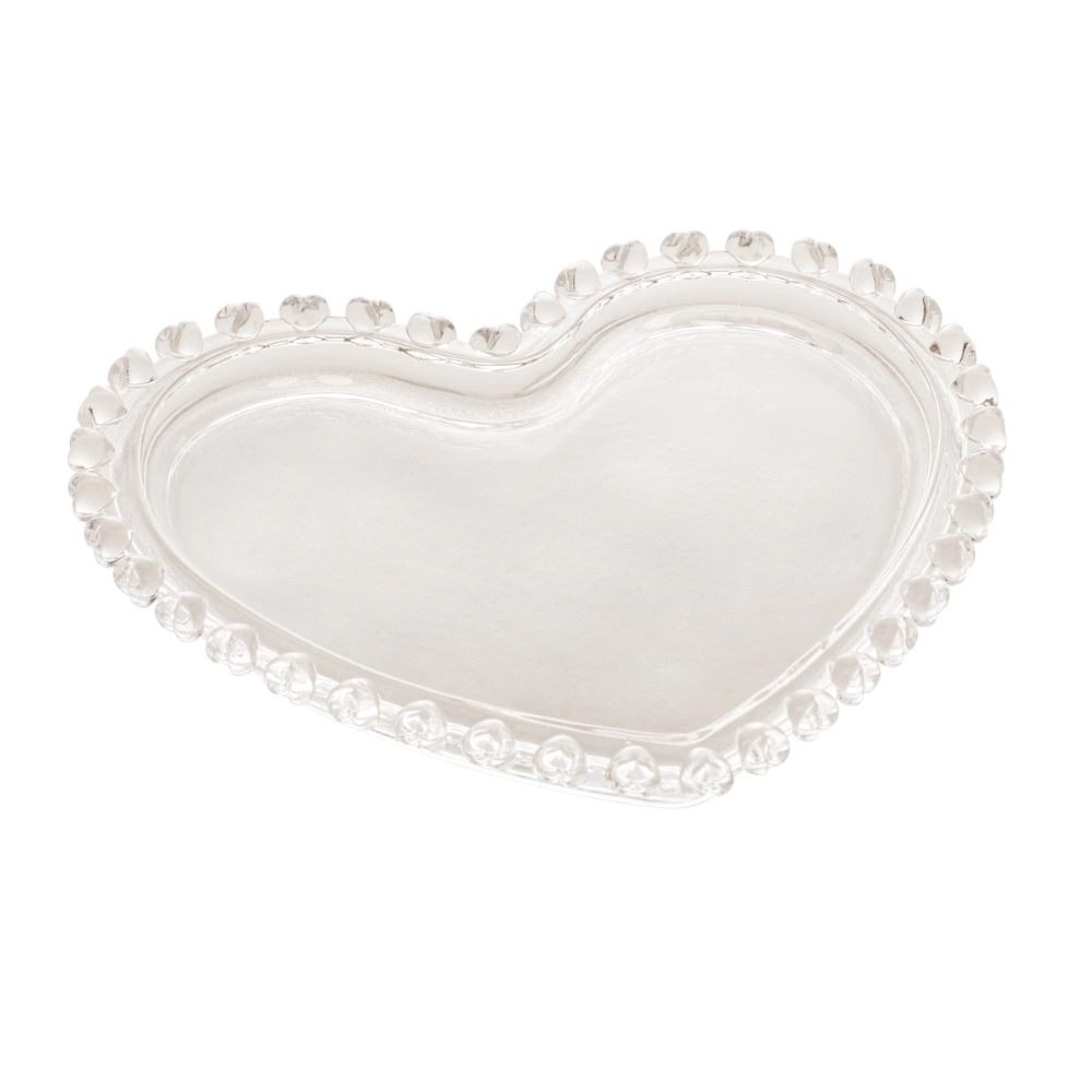 Lindo prato de cristal em formato de coração da linha pearl, decorado com bolinhas e uma transparência incrível que combina com qualquer mesa posta e outras louças coloridas.