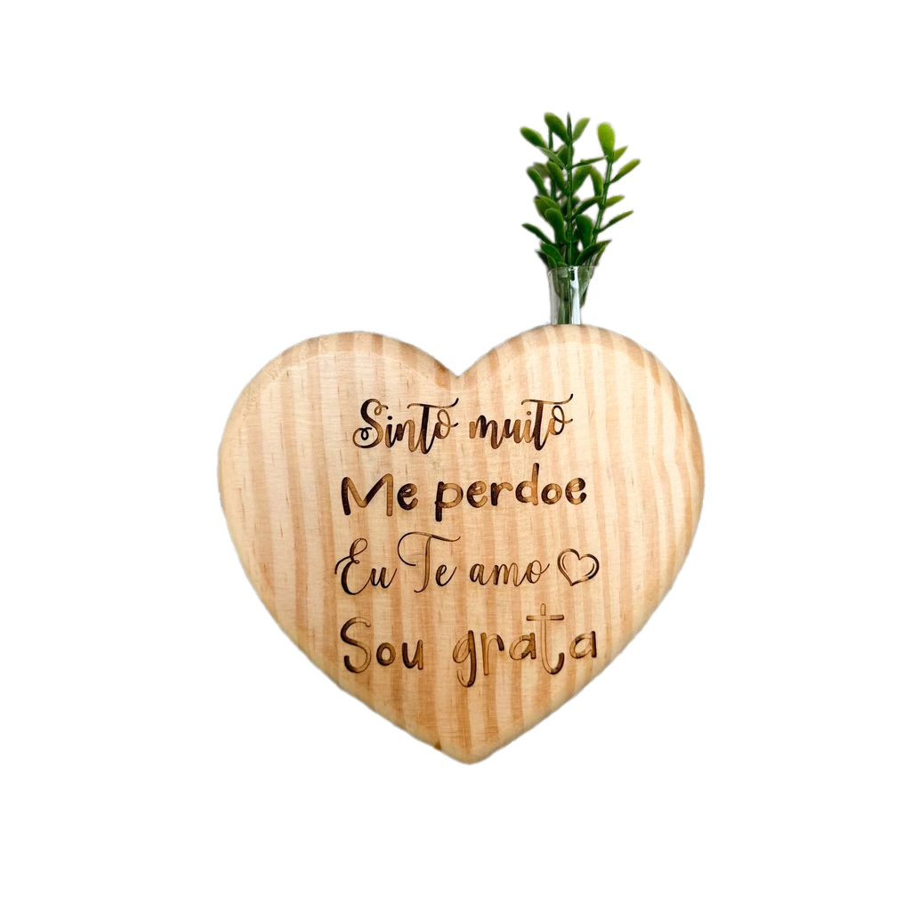 Vaso Decorativo Coração em Madeira - Sou Grata