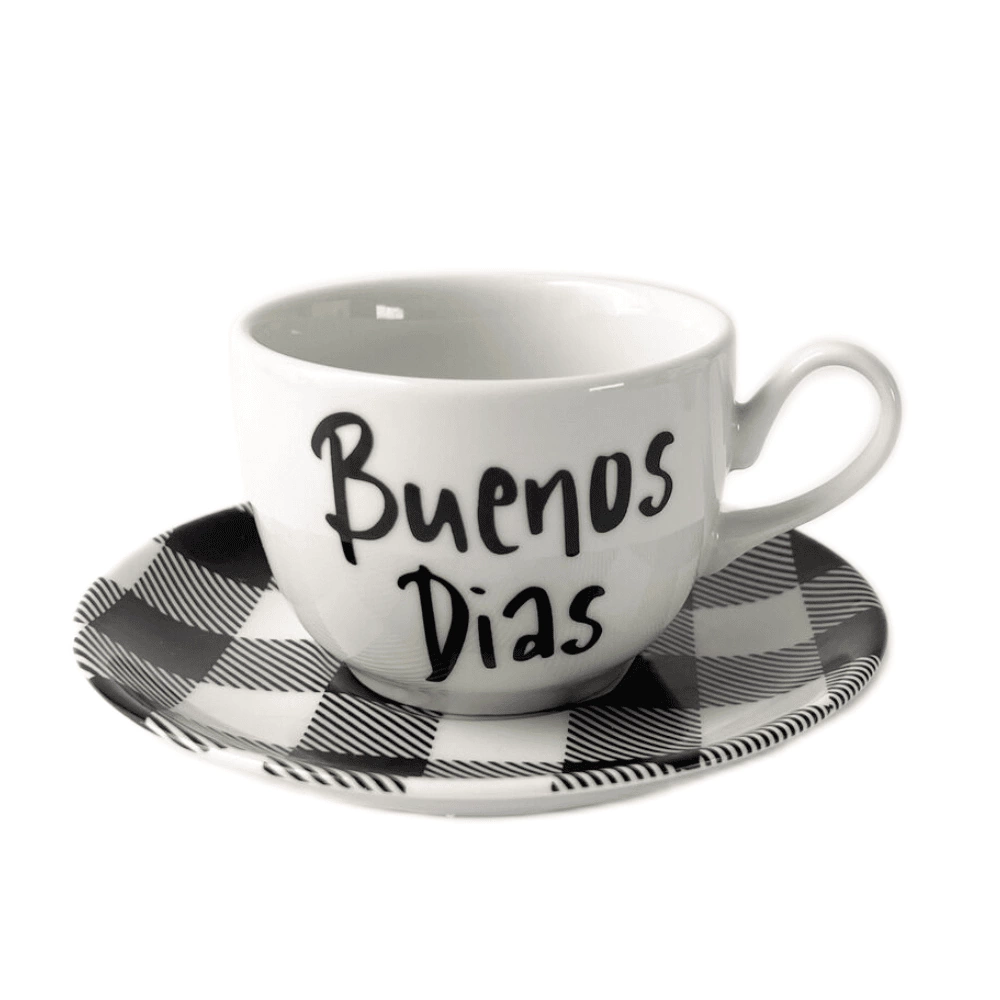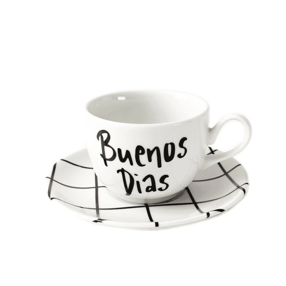Xicara de chá com estampa Buenos Dias, peça que irá encantar a você e a todos que servir com ela. Agrega para a decoração da mesa e lhe entrega personalidade!